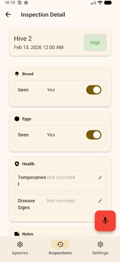 Select your apiary, tap the mic, and talk through your inspection. No commands, no structure — just speak naturally.